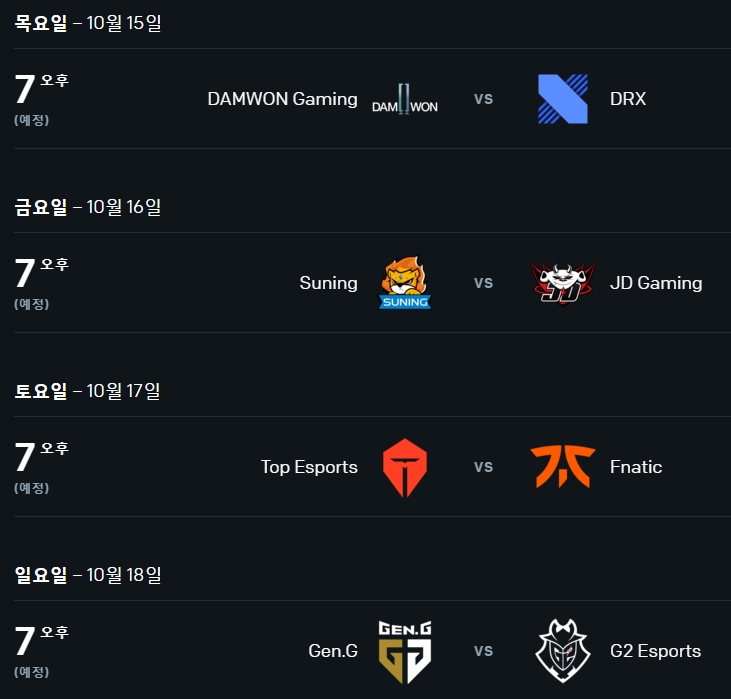 롤드컵 담원 Drx 쑤닝 징동 8강 맞대결 대진 및 일정